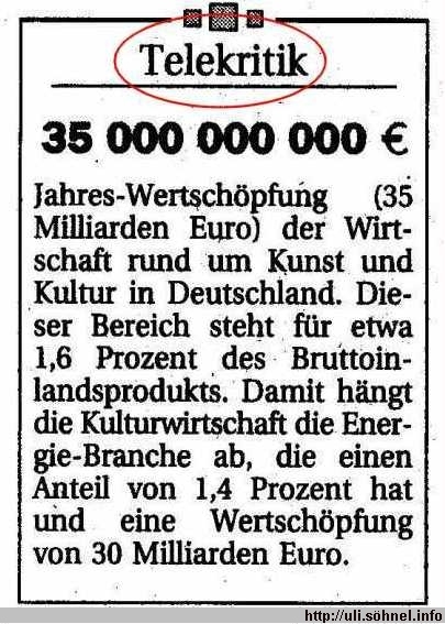 Jahres-Wertschöpfung (35 Milliarden Euro) der Wirtschaft rund um Kunst und Kultur in Deutschland. Dieser Bereich steht für etwa 1,6 Prozent des Bruttoinlandsprodukts. Damit hängt die Kulturwirtschaft die Energie-Branche ab, die einen Anteil von 1,4 Prozent hat und eine Wertschöpfung von 30 Milliarden Euro".