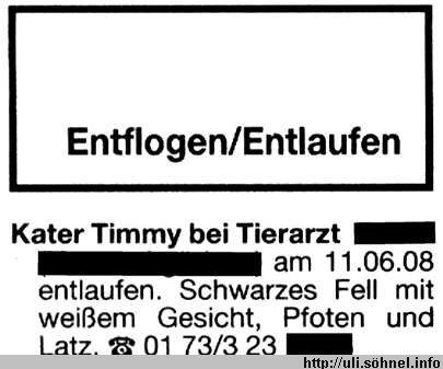 Kater Timmy bei Tierarzt...am 11.06.08 entlaufen. Schwarzes Fell mit weißem Gesicht, Pfoten und Latz".