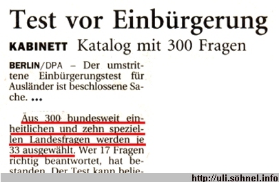 Vielleicht sollten die Schreiberlinge erst einmal einen Mathe-Test machen, bevor man sie auf die Leserschaft loslässt. Es wird nämlich schwierig werden aus 10 landesspezifischen 33 Fragen auszuwählen.