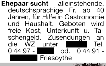 alleinstehende, deutschsprachige Fr. ab 40 Jahren, für Hilfe in Gastronomie und Haushalt. Geboten wird freie Kost, Unterkunft u. Taschengeld..."
