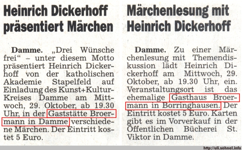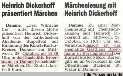 Gleich zweimal werden die Leser der Sonntagszeitung auf die Märchenlesung des Herrn Heinrich Dickerhoff hingewiesen, links für Ortsfremde, denn Damme kennt jedes Navi, aber ob auch Borringhausen gefunden wird ist fraglich.