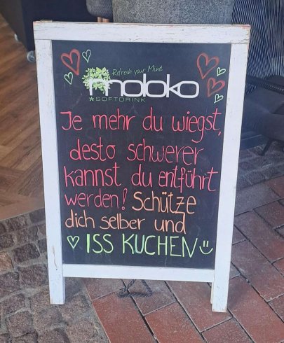 Je mehr du wiegst, desto schwerer kannst du entführt werden! Schütze dich selber und iss Kuchen. ”